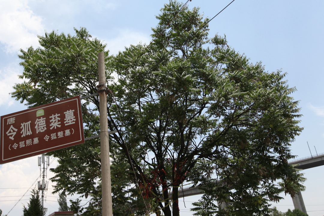 由水泥桥左转驶入一条刚修好不久的路径,前行五百米,看到了地道桥。王帅正准备从此穿过,而郭小爽向窗外一指说:“在这里。”果真在车的左侧看到一个电线杆上树着的介绍牌,上面写着“令狐德棻墓”而下方则用括号小字写着“令狐熙墓”“令狐整墓”,看来令狐家族三代都葬于此,这里应当是令狐家族墓。
