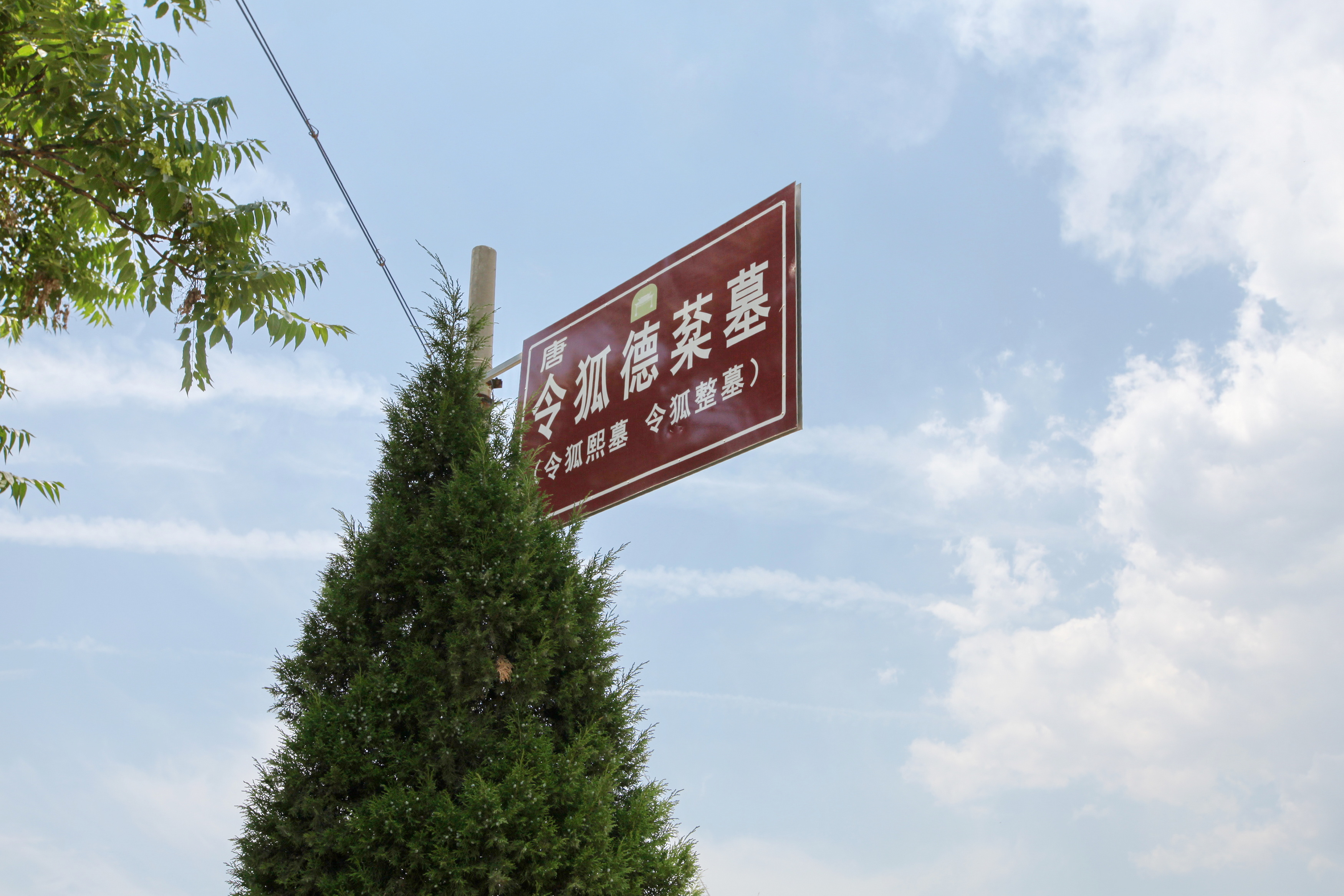 由水泥桥左转驶入一条刚修好不久的路径,前行五百米,看到了地道桥。王帅正准备从此穿过,而郭小爽向窗外一指说:“在这里。”果真在车的左侧看到一个电线杆上树着的介绍牌,上面写着“令狐德棻墓”而下方则用括号小字写着“令狐熙墓”“令狐整墓”,看来令狐家族三代都葬于此,这里应当是令狐家族墓。