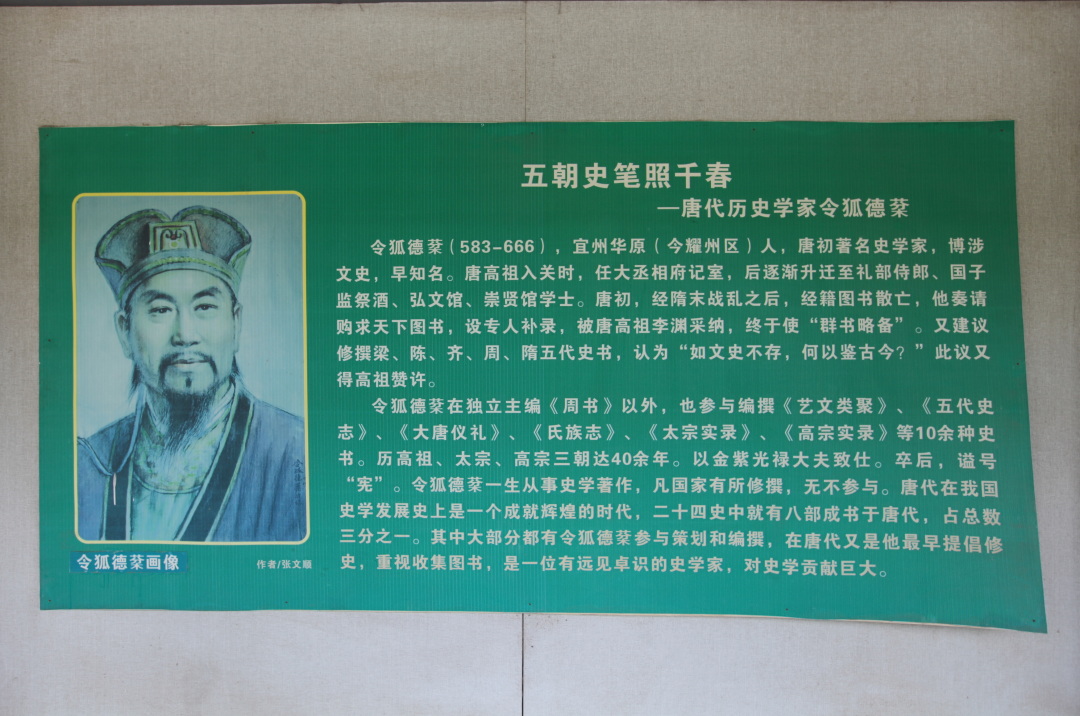拍照完令狐德棻墓,返回耀县县城,而后参观了当地的文庙,在文庙碑廊的对面悬挂着一些展板,其中就有令狐德棻介绍牌。此牌上有令狐德棻画像,不知道此画像的所本,但从其刚毅的脸上可以感受到他对史书的修撰是何等之坚韧不拔,故这个介绍牌的题目为“五朝史笔照千春——唐代历史学家令狐德棻”。