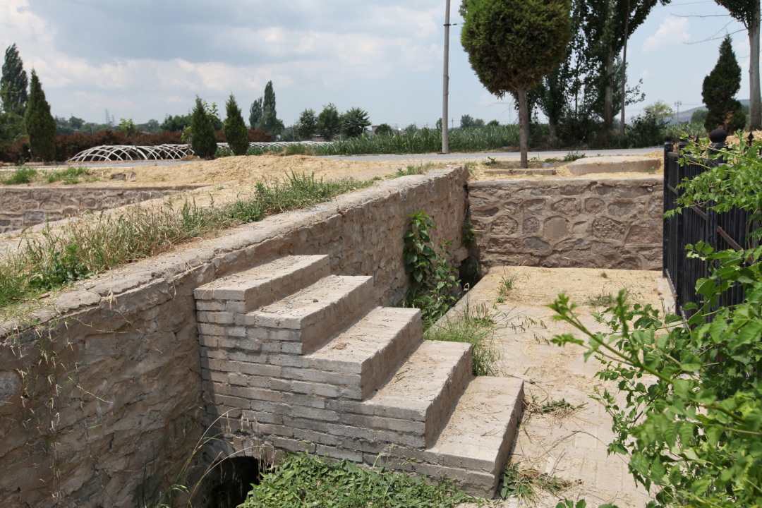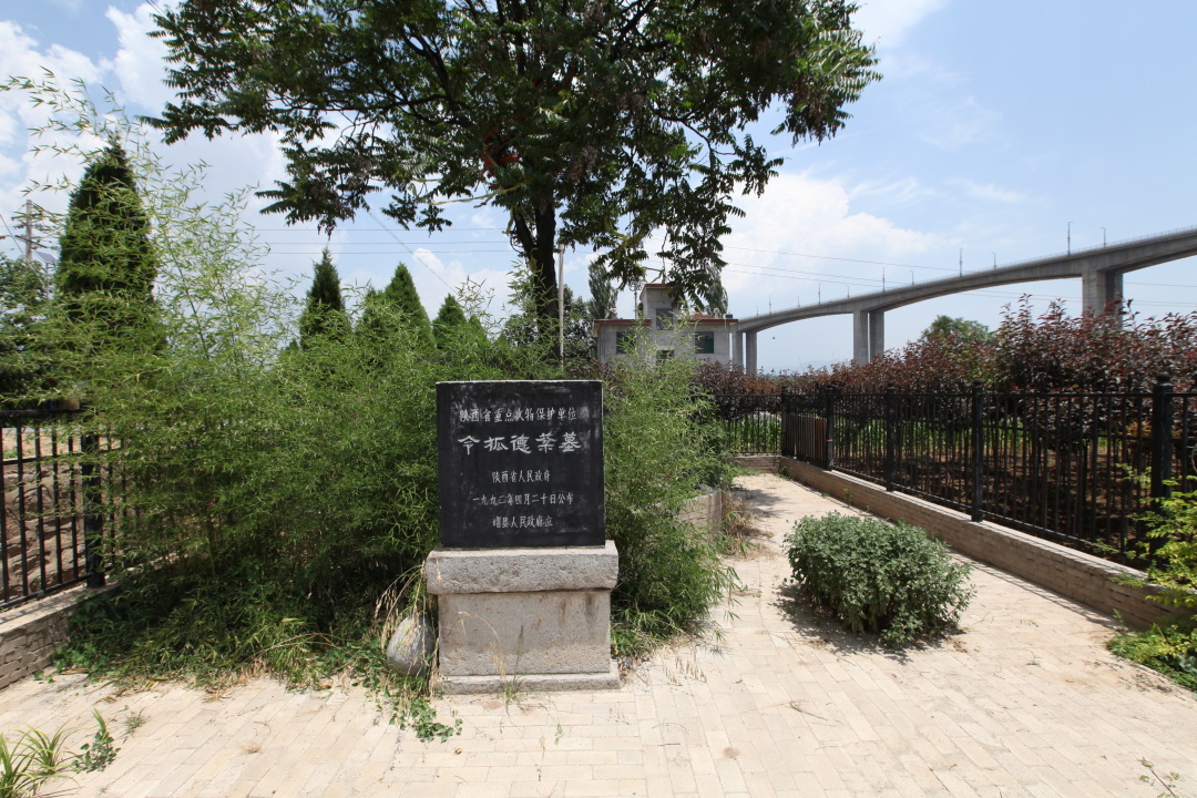然而眼前所见仅是道路左旁有个一百余平方米大小的墓园,墓园中仅有一个墓丘,墓的后方长着一棵树,林叶片看上去这应当是臭椿。墓园用铁栏杆围了起来,因为路基比墓园高出一米多,旁边有台阶可以走到墓园的门前。然而铁栅栏门却上着锁,好在护栏缝隙较大,可以把镜头伸进去拍照。而墓的正前方不是墓碑,而是令狐德棻墓文保牌,然文保牌的基座却是石雕的旧物。文保牌后方的令狐德棻墓直径约两米大小,下方有不足一米高的墓围,墓顶上长满了荒草,而其四围也没有其他的刻石。