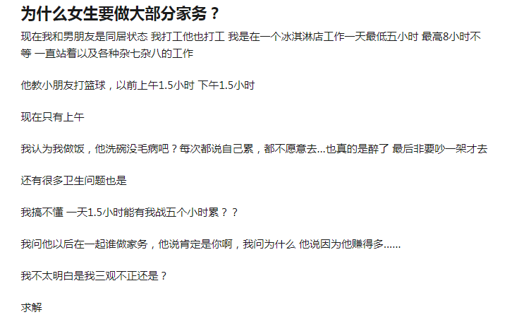 但显然,按照女方的表述,下班后女方拖着更累的身体去做家务的“边际成本”是比男方更高的,具体表现一般就是效率低下。