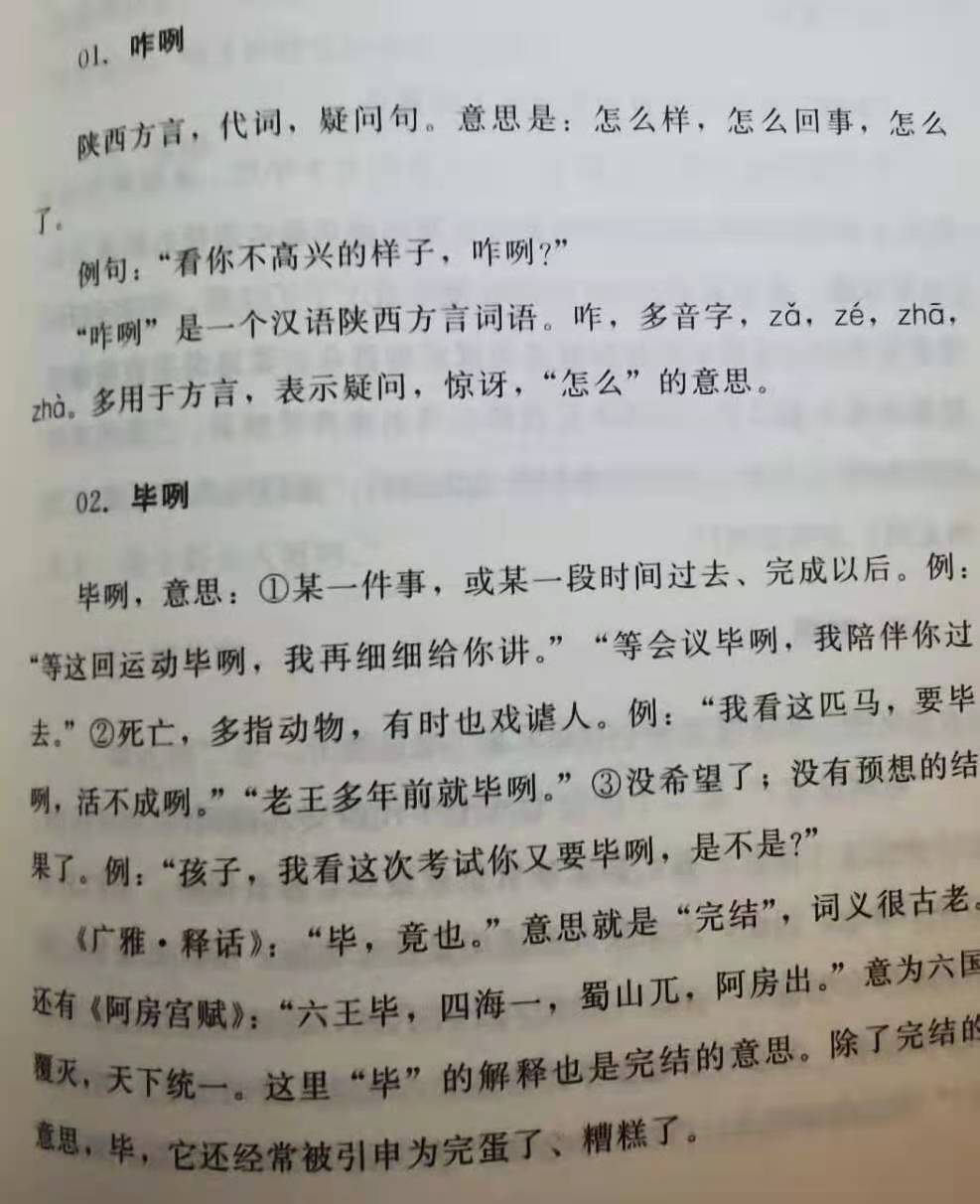 写到这里,我得感谢陕西乡党新芳先生的辛勤劳作,他对陕西方言的系统梳理分析和归类,尤其是对方言字、词的准确书写和读音的准确标注,使人们对西安方言的准确书写和读音有了系统全面的掌握。说实在的,处在这种语言环境中的我,多年来对许多常在嘴边说道的诸如“俀也、蒇活、芒背、麻达、仰尘、搌仆、撩揽、搋面、圪蹴、晳、剺、懔、?……等等方言词,只知这么读,但却并不知道怎么正确书写,新芳先生把这一个个读起来拗口的方言词准确的进行了书写,因为汉字的同音词太多了,要准确的书写一个地域特色、发音特色明显的方言字词,既要查找字词的出处来源,又要在历代典籍中考查使用情况,做许多鉴别比较工作,从而梳理出正确的写法与读音,这是非常认真仔细、浩繁的工作。