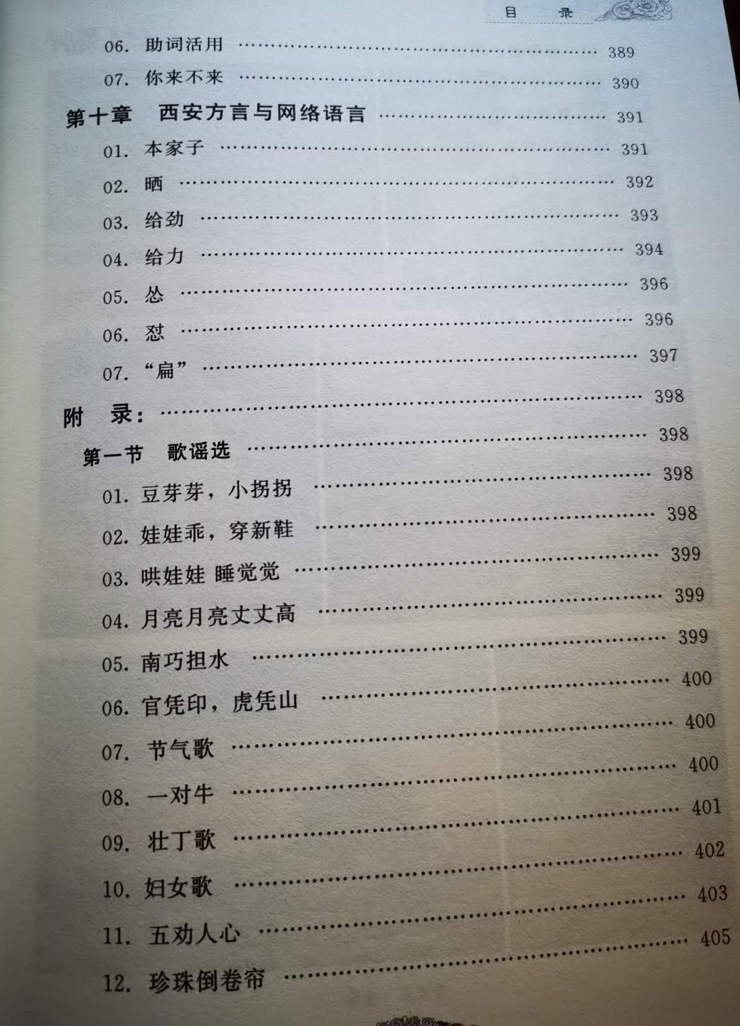 值得一说的是,作者在附录部分抢救性的列举了多段不同内容的流传在关中和西安一带的原汁原味的歌谣,这些歌谣之所以在民间广为流传,读起来朗朗上口,是与对人们熟悉的方言应用是分不开的。如“娃娃乖,穿新鞋(hai),娃娃劳捣猫咬来。猫呀猫,你别咬,咱们俩个从今好。”其中的方言词“劳捣”是调皮捣乱的意思。如谚语“有了一顿,没有了挈棍”里的“挈”是典型的关中方言,是握、拿的意思。有时候一句谚语用好一个方言字词,便具有画龙点睛的作用。