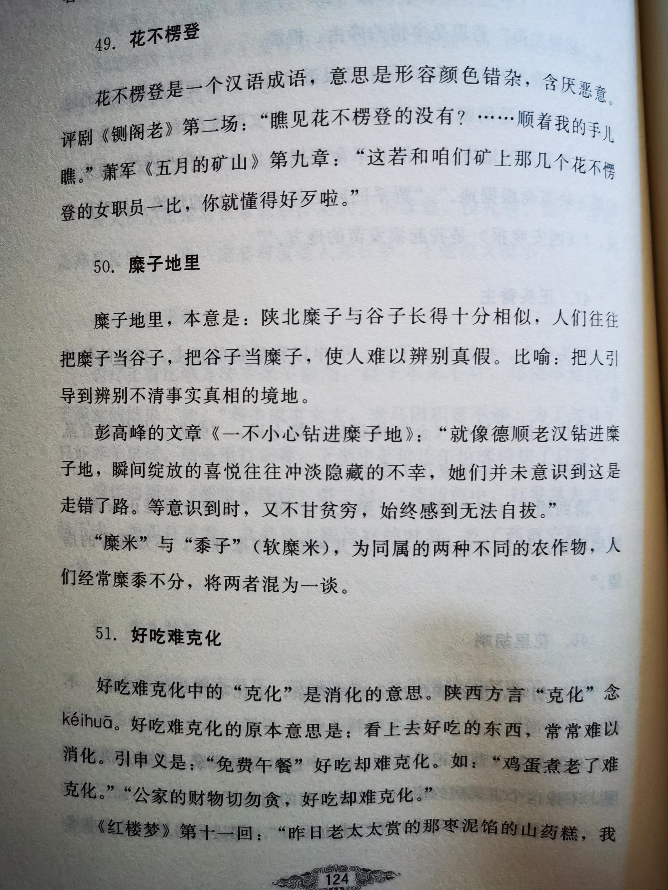 通读《西安方言文化溯源》所列举分析的各类方言,让我倍感亲切的是关中和西安一带流传下来的人们正在使用的种种方言,就其读音、语法、释意等与泾河源头的泾源县人们使用的方言几乎如出一辙,没有任何差别,像典型的方言词“颇烦、俀也、蒇活、言传、谝闲传、日鬼倒棒槌、芒背、麻达、仰尘、搌仆、撩揽、细发、念弄、圪蹴、倒灶、骚情、麻利、日囊、咋咧、吃咧、晌后、帕帕、芫荽、茶饭、属迷、胡里麻达、尕达马西、克里马擦”等在书面语中少见的方言,在日常生活中的应用十分广泛。还有哪些众多的语音特色明显的方言,有着与普通话不一样的发音与读法,令人称奇的是这些方言字词,西安人怎么发音怎么读,泾源人就怎么发音怎么读,包括释意也没有任何的不同。“下ha数”陕西方言是规矩、礼节、章法的意思,陕西人常说,泾源人也常说。“箸笼罐”是陕西人的灶房用具,是用来插放筷子的竹子编制的物件,普通话叫筷子篓。记得小时候的农村里,家家案板前都挂着一个箸笼罐,吃饭时都从箸笼罐里取筷子,泾源人不但说箸笼罐,用箸笼罐,而且人人都会编箸笼罐呢。而这一方言词最早见于《礼记.曲礼》一直沿用至今。“日噘”这一方言是批评、训斥的意思,是吊在陕西人嘴边的方言,泾源人至今在口语交流中使用着:“那怂娃做事太差劲了,让他大美美的日噘了一顿。”某个女子长的好看漂亮,关中人说这女子长的“皙”,泾源人夸漂亮的女子要么说攒劲,要么说“皙”。“芒背”是西安方言里颇烦、忧愁、焦躁不安的意思,西安人常说,泾源人也常说,一声简单的“芒背”把以上种种意思都表达了,还有诸如“骚情、麻达、撩揽、二杆子、三对六面、三锤两帮子、五麻六道、一头抹脱了一头挑担了、匝长共短、贼打鬼”等方言词组,每每看到这样的方言,不用过多的解释,意思自明。