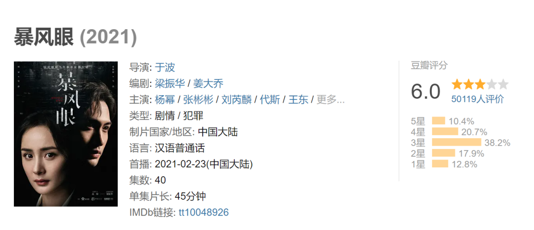 提到这部新作《风暴舞》的同时,就不得不让人想起今年二月份播出的《暴风眼》,杨幂和张彬彬领衔主演的同类型作品最终只收获了6.0的评分,由此可见国安题材并不是一个容易出分的好项目。