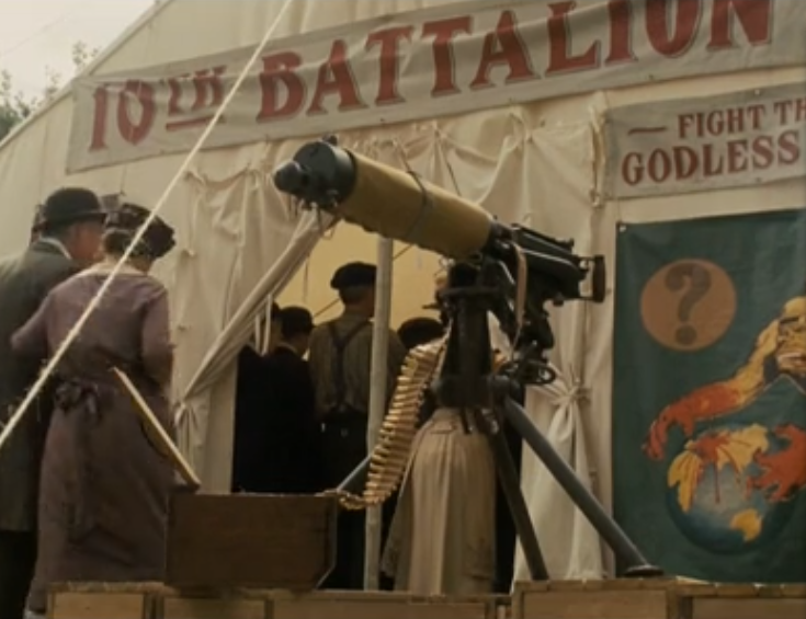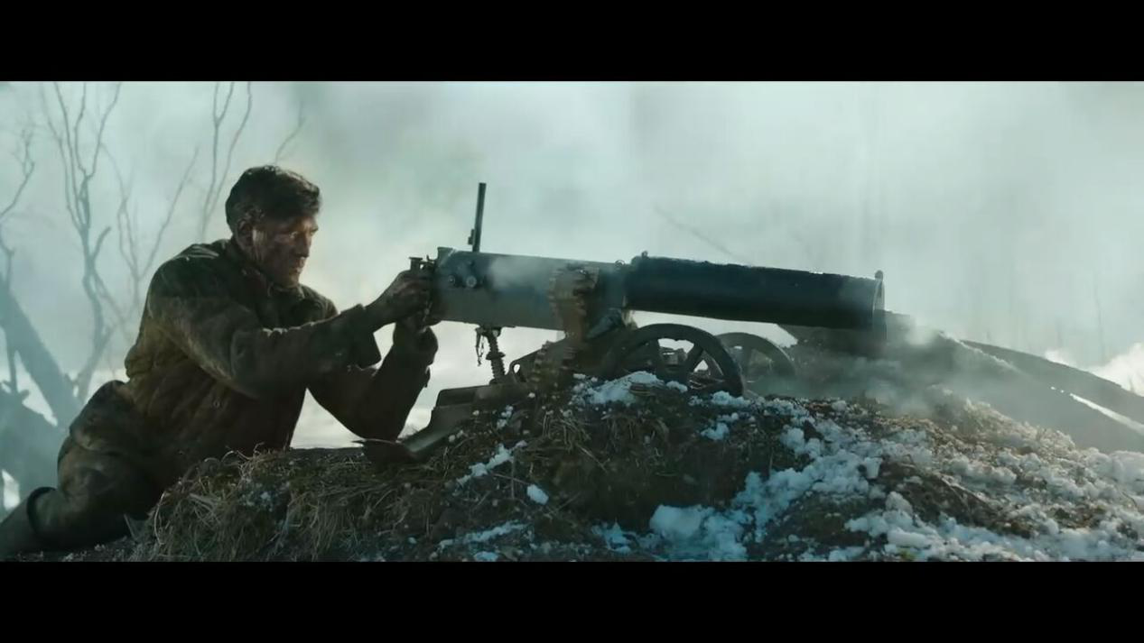 由于mg08是在一战中大放异彩的,那么反映一战的电影都会有德国马克沁的出现。2011年上映的《战马》中,德国人用mg08式重机枪让英国骑兵全军覆没,堑壕战中又让英国步兵在弹雨中艰难前行。特别是英国骑兵偷袭德军营地的部分,德军宿营是在空地上,但是重机枪阵地构筑在树林的边缘,树林边缘外是开阔地,利于重机枪发挥火力。一旦被偷袭,德国人可以跑进树林隐蔽自己,然后用提前准备好的重机枪向来袭的骑兵猛烈开火,而且骑兵面对重机枪是非常不利的。