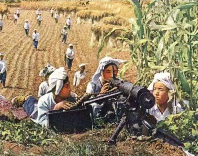 ▲我国民兵的二四式马克沁重机枪,解放后交付民兵使用的二四式马克沁更换了7.62毫米口径枪管并使用金属弹链