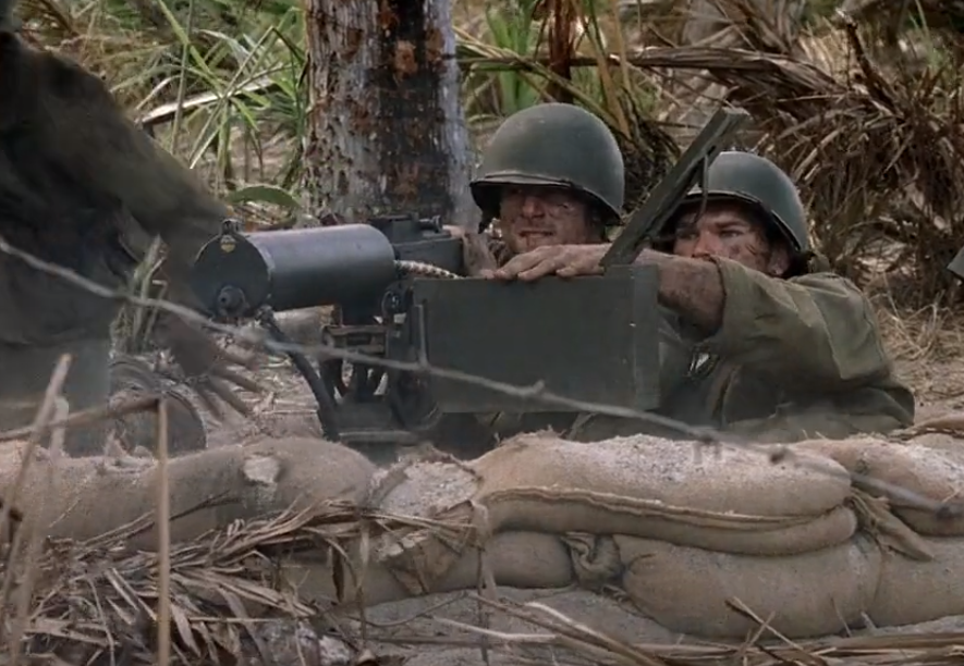 《太平洋》的第一、二集,美国海军陆战队第1师参加了瓜达卡纳尔岛战役,片中角色以机枪小组的身份出现在了瓜岛的丛林里。在第一集里,美军机枪小组在河口位置构筑了阵地,并在夜间战斗中发挥了火力优势,给予偷袭的日军迎头痛击。第二集中的美军机枪手,在丛林的边缘处构筑了完备的机枪工事,日军夜袭时成为了阵地上最主要的火力输出,严密封锁了日军的密集冲锋。