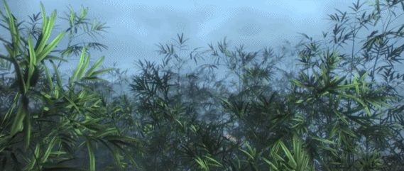 在竹林掩映下,伴随着细雨,两人使用竹枝打斗。