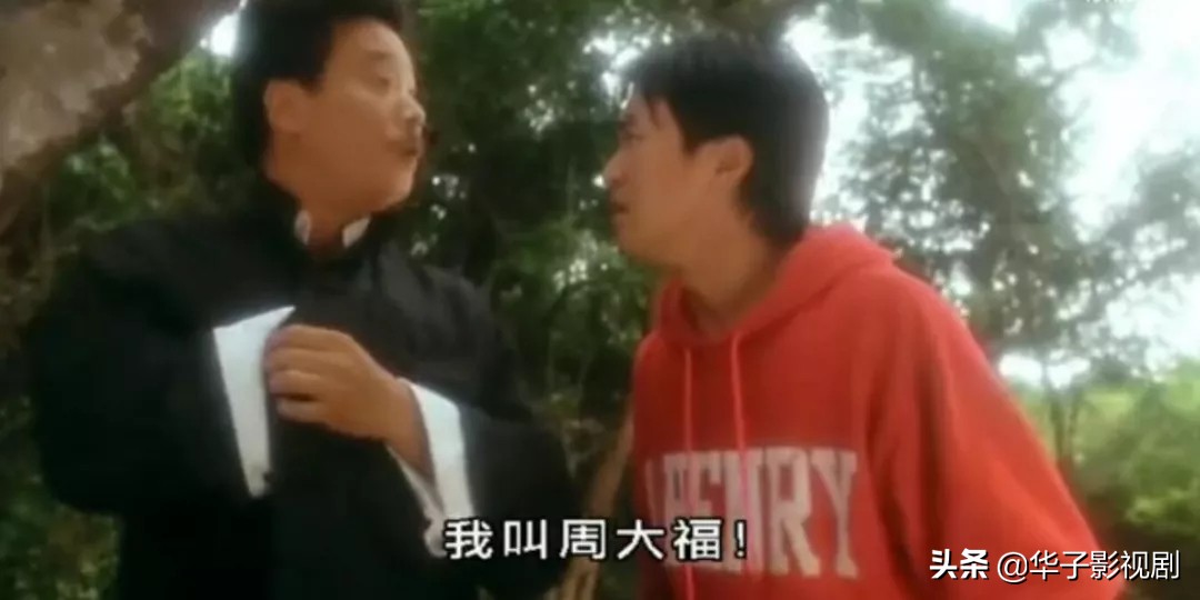 爷孙俩相认后,周大福带着星爷一起往家走,不料路上碰到两大黑社会性质犯罪组织互砍。可能是看星爷不顺眼,其中一个黑道大哥连星爷一起砍,还好星爷不是吃素的,使出一招隔山打牛一拳将其击毙。强尼一看,不秃头没金链,纹身还没外露,冒充啥社会大哥,不打你打谁!
