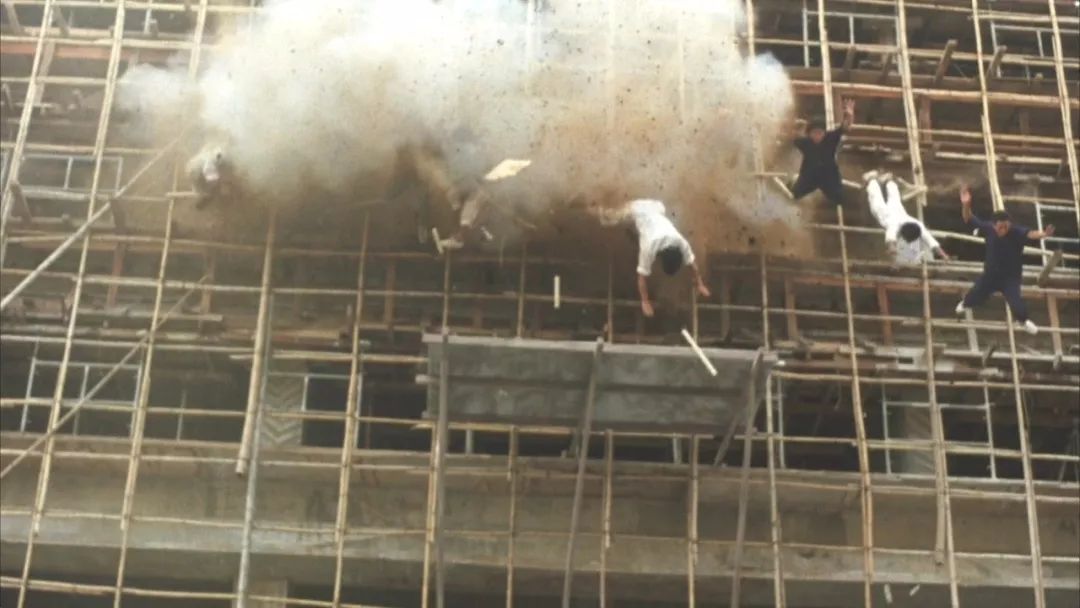 电影的最后有一场爆破戏,随着一声爆炸,有8个人同时从楼上跌落,这个镜头危险系数达到五星。