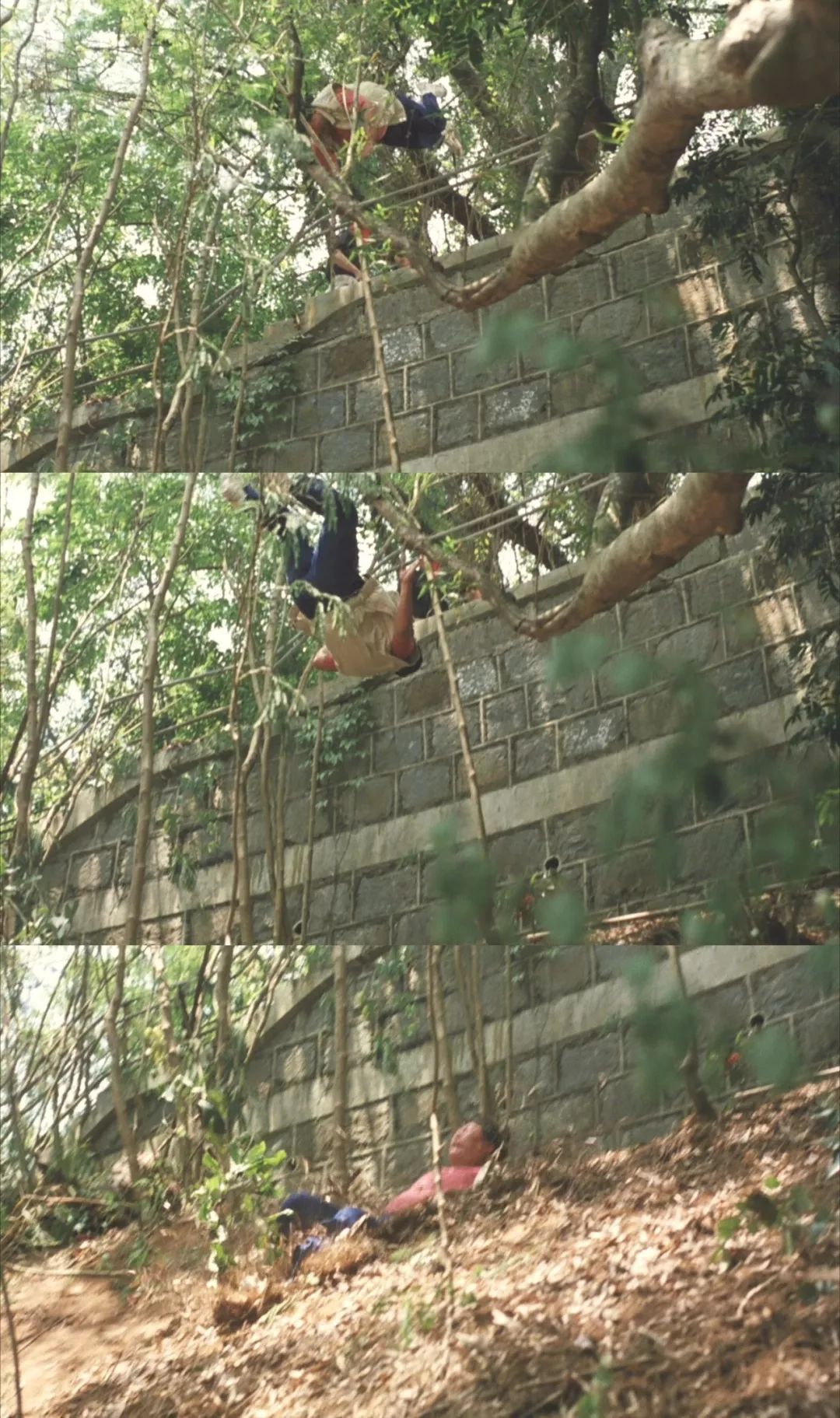 洪金宝饰演的冯度虽然不用打斗,却也少不了危险镜头,其中有一个被一脚踢中下巴而掉下山崖的镜头,从高处翻下重重摔在地上,还要翻滚很长的距离,危险系数也极高,不是一般人敢做。