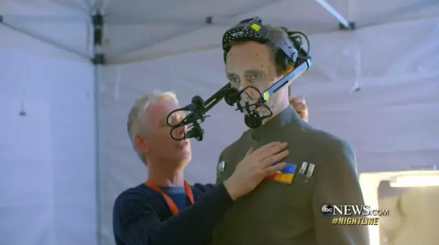 同样将面部表情捕捉技术作为复活术主心骨的还有2017年上映的《星球大战外传:侠盗一号》.这部电影中对演员彼得·库欣的复活完成了有史以来最复杂、最昂贵的cg人物重塑。工业光魔接下了此次特效任务的重担,同样是借助《本杰明·巴顿奇事》中脸部资料库的思路,通过提取演员过往影像资料中的面部特征建立了面部表情库,用于制作3d模型。与《速度与激情7》不同的是,本部电影中塔金总督的角色戏份十分吃重,且多有演员的面部特写,因此对替身演员表演和3d模型的要求更高更细致。剧组特地请来了身材相貌都非常接近彼得的英国演员guy henry作为替身演出,他反复观察塔金总督的角色演出,完全模仿彼得的表情和表演方式在蓝幕前表演。当他戴上动态捕捉系统后,表情和动作即可直接与三维制作软件中的3d模型相匹配。而后只需抠除替身演员的头部图像,换上制作好的彼得的头部3d模型即可达到最终效