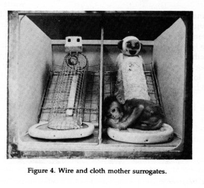在“恒河猴”实验中,哈洛用绒布妈妈和铁丝妈妈作为小猴子的代理母亲,两个“妈妈”都有一个喂奶的“乳房”,但不同的是,绒布妈妈她有“接触安慰”也就是说绒布是柔软的,能够带给小猴子温暖的安全感,而铁丝妈妈却是冰冷的,所以即使铁丝妈妈也给小猴子喂奶,但是她没有给小猴子温暖,故此,小猴子会对自己的铁丝妈妈无感,并且长期处在长期缺爱的环境中,经过这么一个实验哈洛最后得出的结论震撼了整个世界。