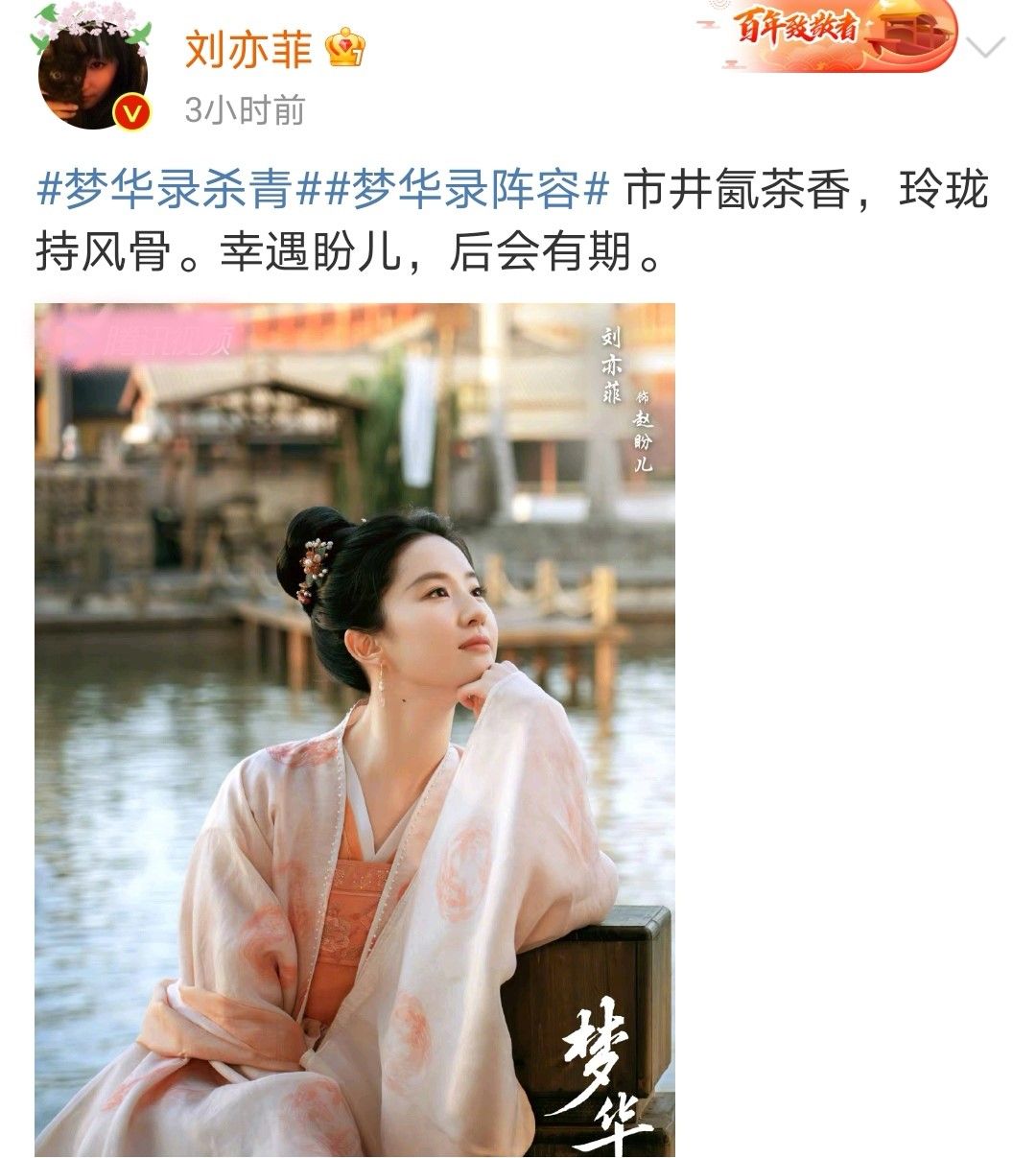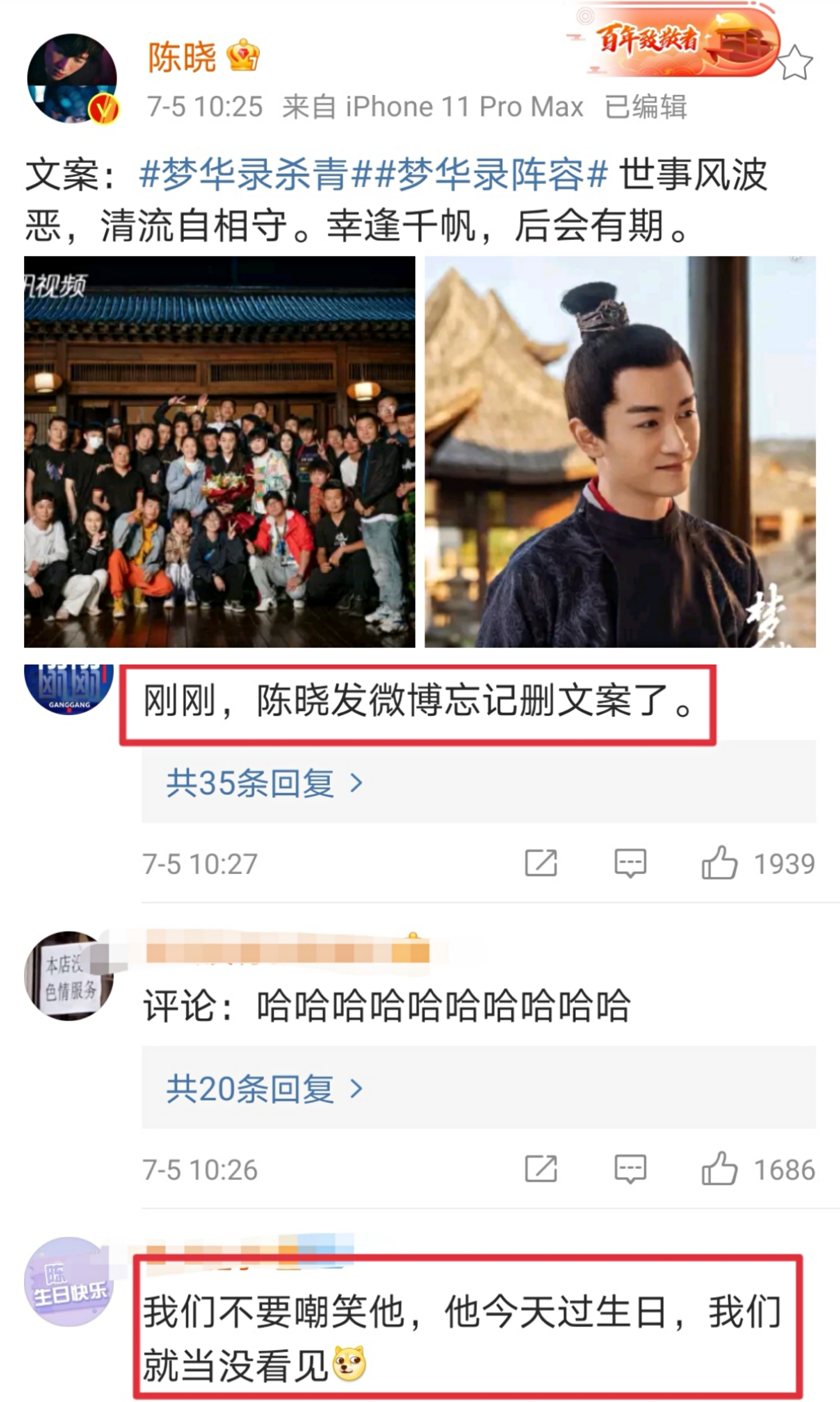 饰演男主角“顾千帆”的陈晓当然也一样,但陈晓可能是沉浸在今天过生日的快乐中,迷迷糊糊地把“文案”两个字也发了出来,闹了个不大不小的乌龙:“文案:#梦华录杀青##梦华录阵容# 世事风波恶,清流自相守。幸逢千帆,后会有期。”