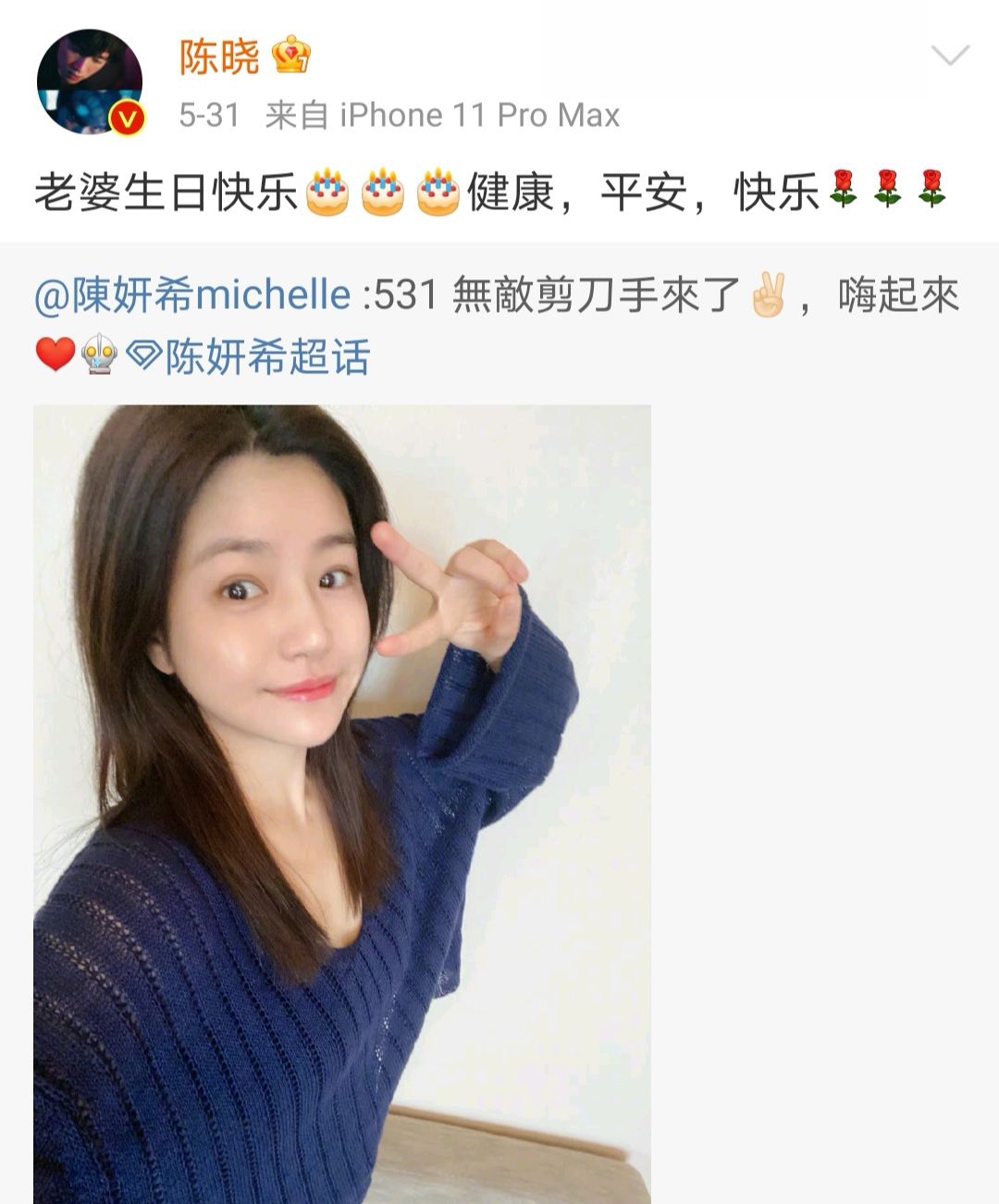 今年的5月30号是陈妍希的生日,许久未和陈妍希互动的陈晓破天荒地发文祝陈妍希生日快乐,似乎也是在巧妙地回应“乱点鸳鸯谱”的网友,我们好着呢!