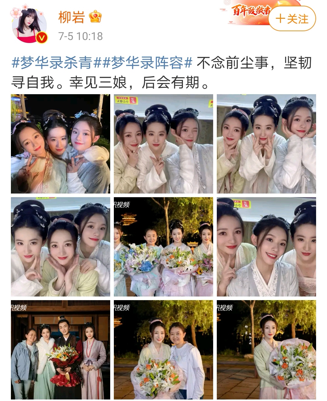 7月5日,由刘亦菲、陈晓主演的古装大剧《梦华录》正式杀青,并发布了杀青特辑。刘亦菲、陈晓、林允、柳岩等主演也纷纷发博,和自己的角色深情告别。