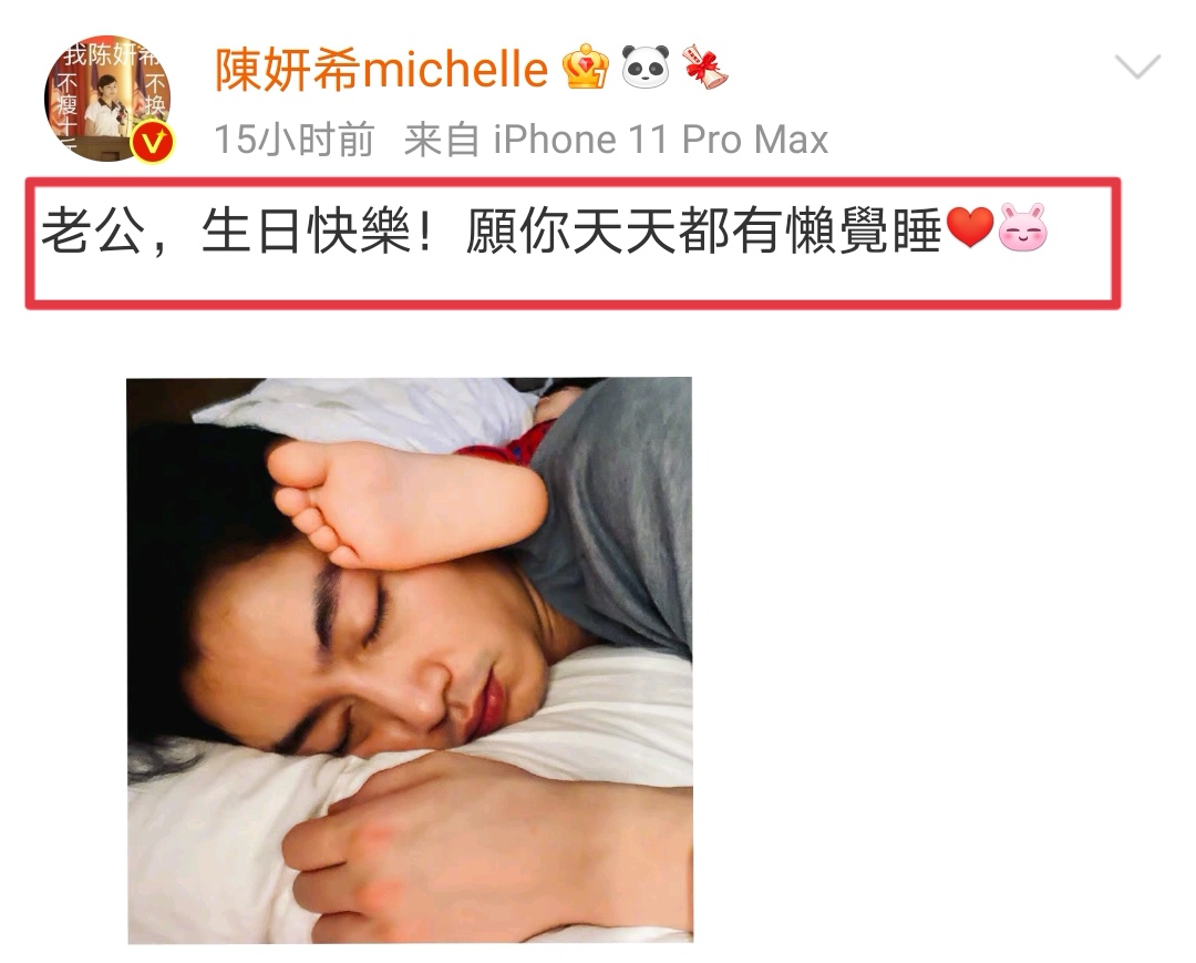 当日零点,陈妍希就发博为老公陈晓庆生:“老公,生日快乐!愿你天天都有懒觉睡”,并配上了一张陈晓睡觉时,儿子小星星把脚丫伸到爸爸头上的可爱照片。