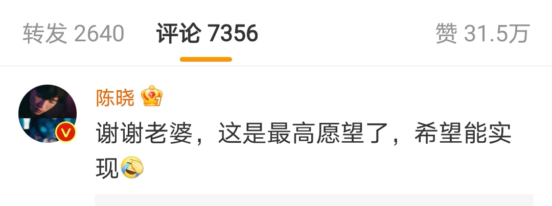 陈晓也在醒来后,于上午十点十八分回复了陈妍希:“谢谢老婆,这是最高愿望了,希望能实现”。