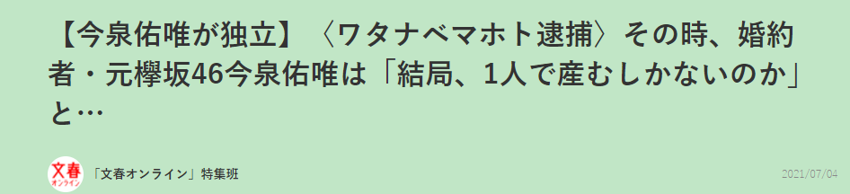 即使2017年已经从偶像团体中毕业,但年轻的今泉的未来还是被认为有无限可能。令人有些没想到的是,今年1月今泉突然宣布怀孕,并曝光了和男友的结婚计划。