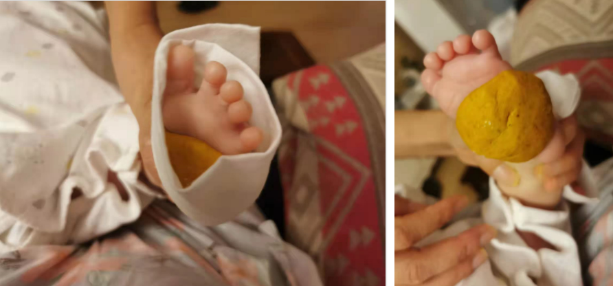 睡前用黄栀子粉+蛋清+面粉搓成面团,敷在手脚心,用布带缠住,晚上哭闹就不会那么厉害了。