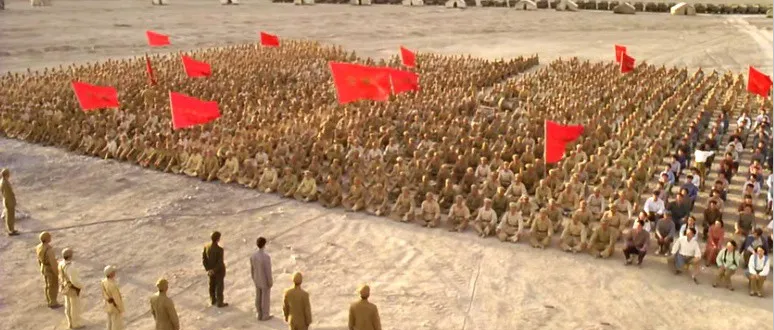 浩浩荡荡的队伍疾驰在沙漠中,黄沙滚滚,红旗猎猎。