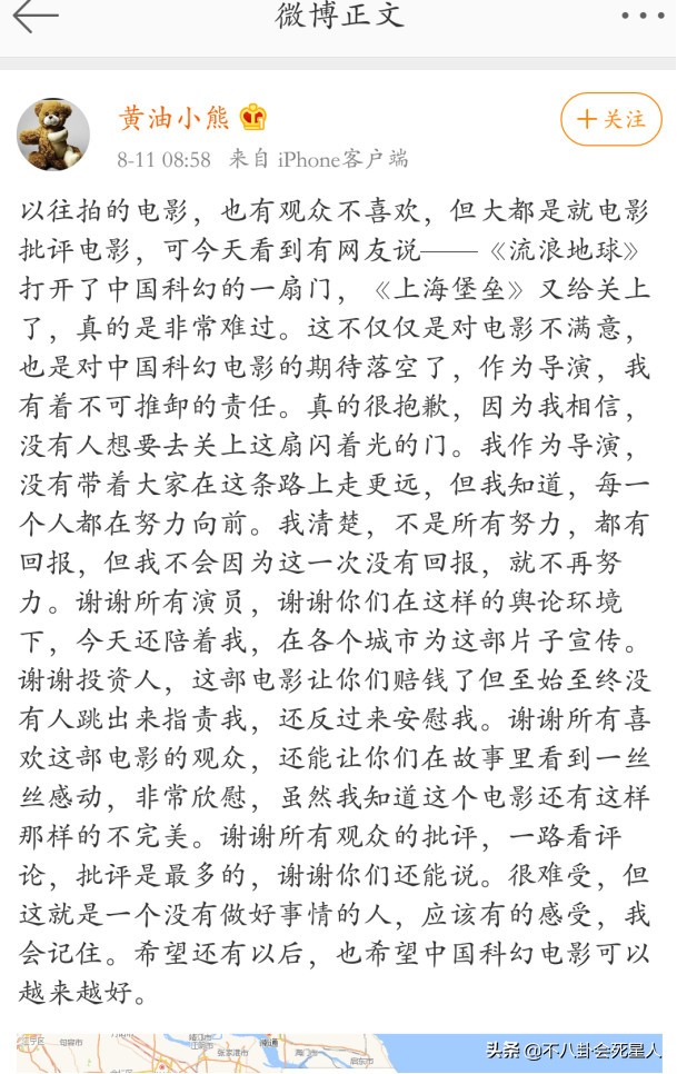 在电影上映的第3天,也就是8月11日,电影导演滕华涛终于顶不住火力,在微博上发了致歉长文,他坦言自己在看到恶评之后“非常难过”,同时也全盘接受了意见和建议,并表示自己还会继续努力。