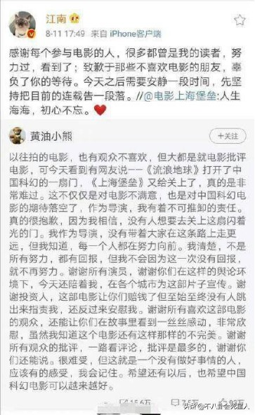 影片的原作者兼编剧江南随后也转发了那条微博,同样向观众和读者表达了自己的歉意,说自己要安静一段时间,小8以前也很喜欢江南的《龙族》,不可否认,他是个优秀的作者,但他的编剧才能却显然不尽如人意。