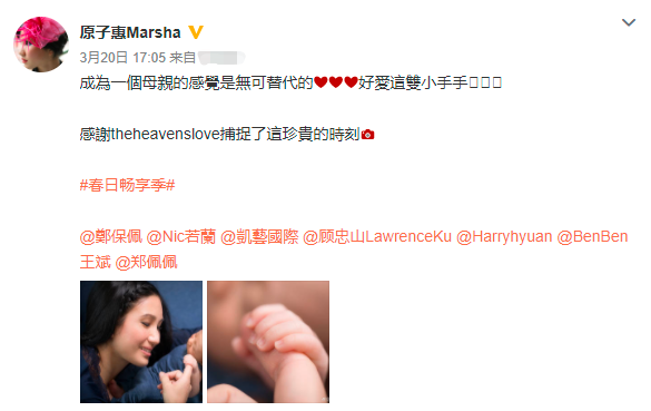 3月20日,郑佩佩的女儿原子惠在微博上晒出两张与儿子的温馨合照。照片中,原子惠看着紧紧攥着自己手指的孩子,一脸温柔。