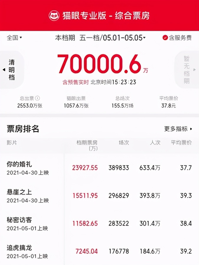 各种类型应有尽有,头部影片爱情、悬疑、动作三大类开始票房角逐,截止目前总票房已经破7亿。如果只计算国产片票房总和,今年五一档创下了有史以来最高票房成绩,也是近两个月以来大盘最高的一天。