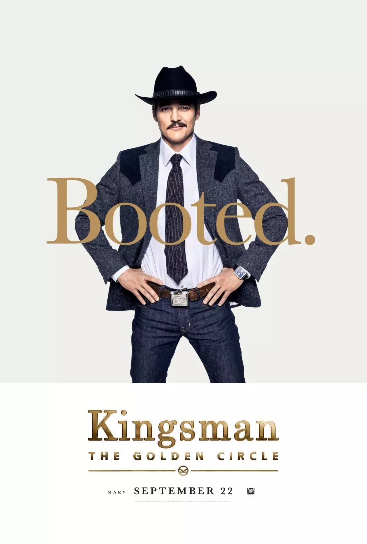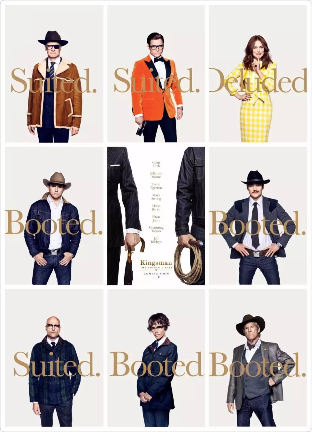海报上的“booted”阵营代表的就是美国的statesman成员,他们在穿衣方面跟kingsman完全不同路数,是美式休闲的代表,牛仔帽和西服配牛仔裤的设计就透着他们满满的西部味儿,堪称是美式休闲搭配教科书——