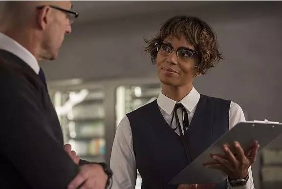 而statesman里的哈利·贝瑞这次不再是性感的猫女,而是走起了技术宅的路线。作为组织中的女性,哈利·贝瑞造型十分男性化,衬衫和夹克配上利落的短发,干练程度五颗星!