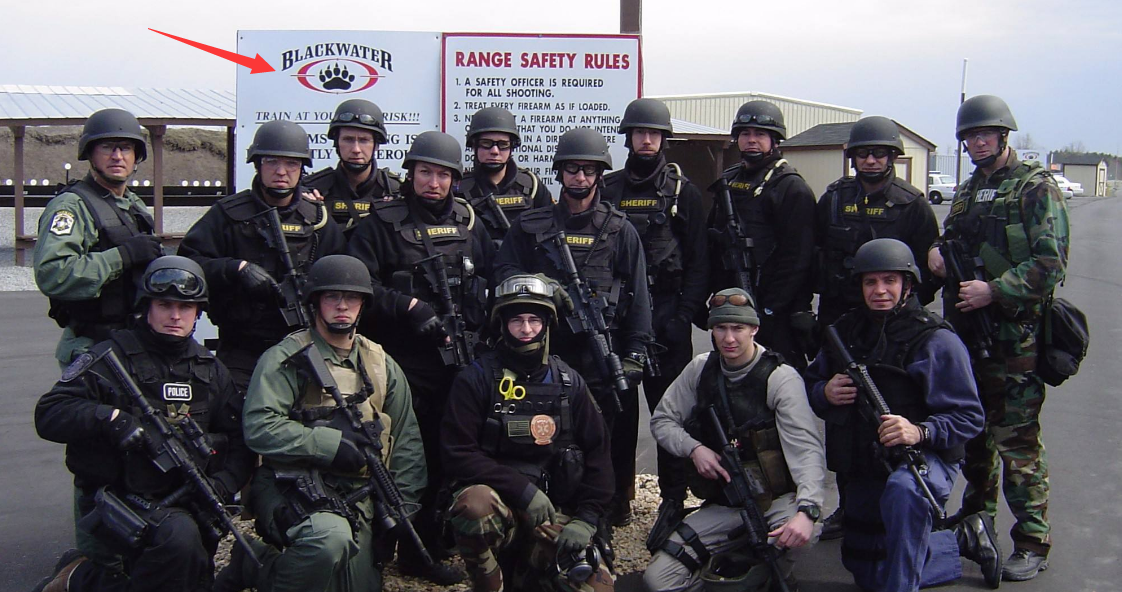 ▲黑水公司成员合影,背后是标志性的熊爪图案