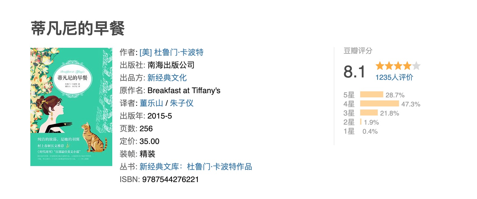 薄薄的一本《蒂凡尼的早餐》,以螺旋式的故事节奏,紧跟着我们翻阅书页的手指,即使你只需要花一下午的时间,就能读完卡波特花了3年时间才完稿的《蒂凡尼的早餐》,也无法阻挡它持续对我们散发出的影响力。