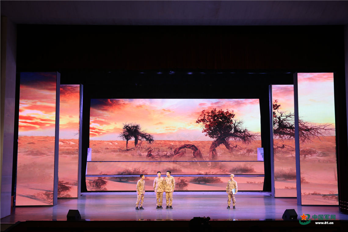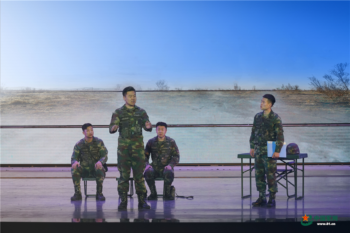 情景剧《心中的胡杨》中指导员对三名战士进行心理疏导。