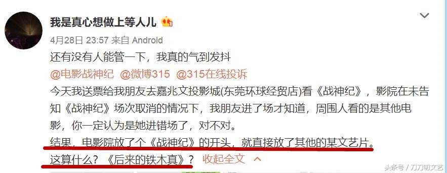 其实早在官微今天发问之前,昨天就有网友在网上曝光自己的奇遇:明明是买了《战神纪》的电影票,进场却放了一会《战神纪》的开头,接着就被掐断,改为放映《后来的我们》了。