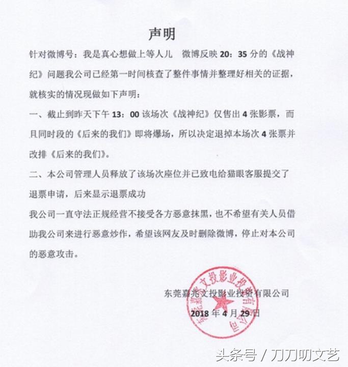 对于网友“气到发抖”的这件奇葩遭遇,该影城今天也做出了回应:说是因为《战神纪》那场只卖出了4张票,另一边《后来的我们》又爆场了,于是影城就自己决定把票退了,改排《后来的我们》。