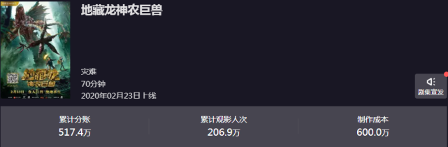 《地藏龙神农巨兽》票房成绩如何?影片2020年2月23日上线,首日就收到116万,第二天收149万再创新高,第三天大卖113万票房。截止2月27日,累计分账票房破517万元,付费观影高达206万人次,又一部网络电影票房大卖了。现在片方只差83万就回本了,该片才上映不久,它还有那么长的放映时间,往小了说最后投资人净赚几百万没任何难度吧?