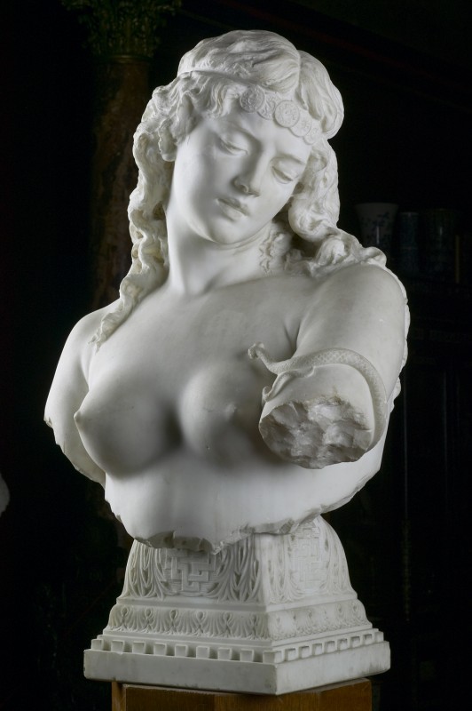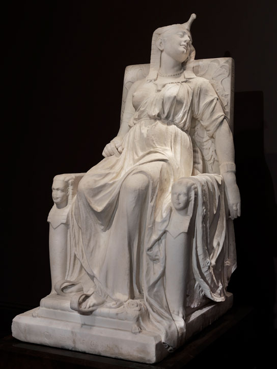 在他1876年所创作的《克丽奥佩特拉之死》中,刘易斯少有的对女王一生展现出了同情,非但没有那个属于文学作品的毒蛇。恰恰相反,在宝座的两侧,他还雕刻出了两个有着小孩面孔的狮身人面像,以代表她和安东尼奥所生的双胞胎孩子。