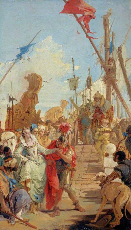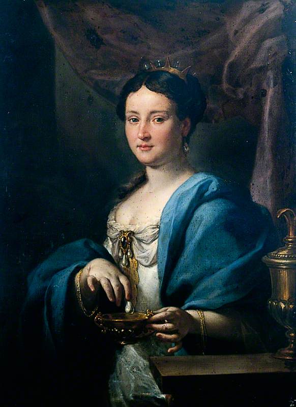 这一身份在提埃波罗(giovanni battista tiepolo)的画里被描绘出了一部分:她更像是位文艺复兴时期的女性统治者,优雅地漫步于船上,有着小丑和仆人的陪伴,炫耀着财富和威严,并让罗马将军安东尼奥臣服于她的个人魅力。