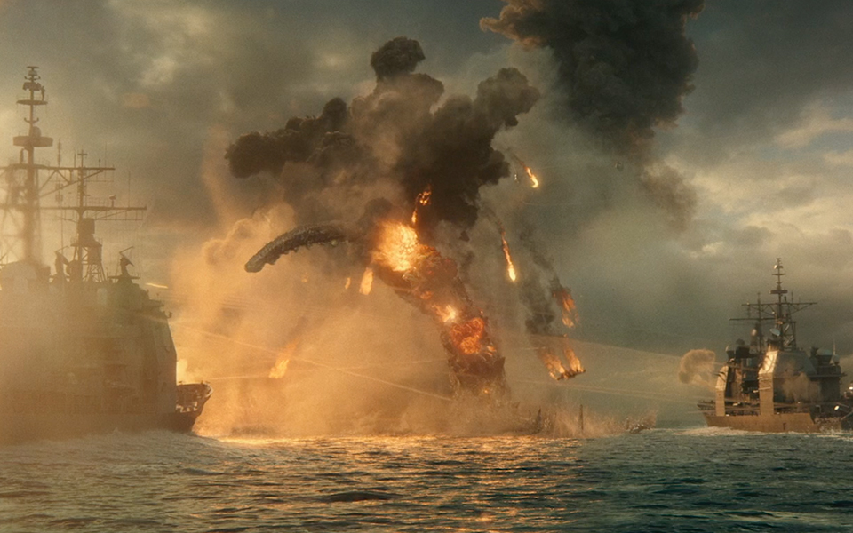 哥斯拉背脊切割将几艘战舰撞毁,从中间一分为二,随后沉没。
