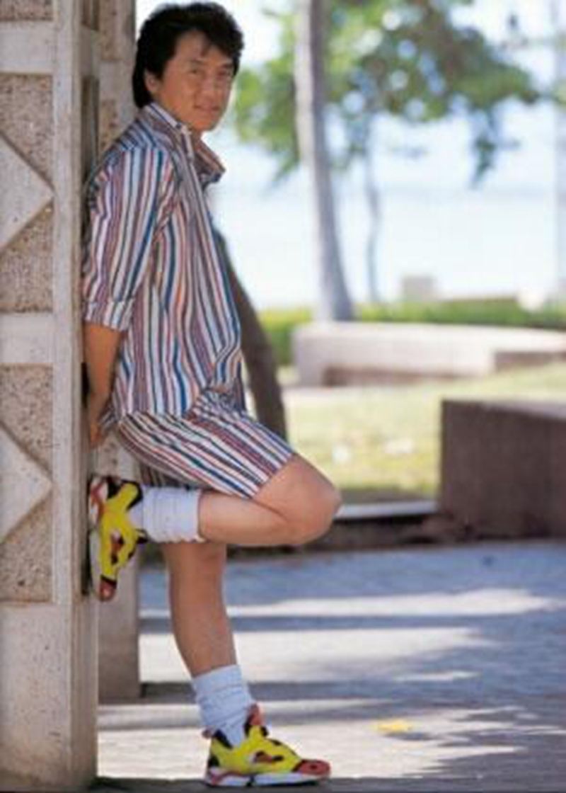 球鞋方面,最著名的就是 reebok instapump fury,夸张的配色和科幻的造型与成龙年轻时骚气大胆的着装风格相得益彰。