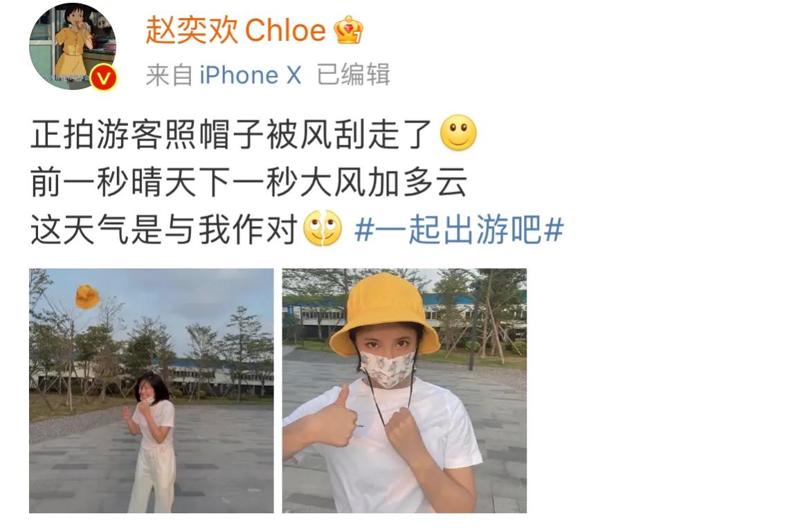 在五一小长假中,赵奕欢的两张游客照,因为拍照时帽子被风吹走,赵奕欢的这条动态,直接登上了热榜前列。