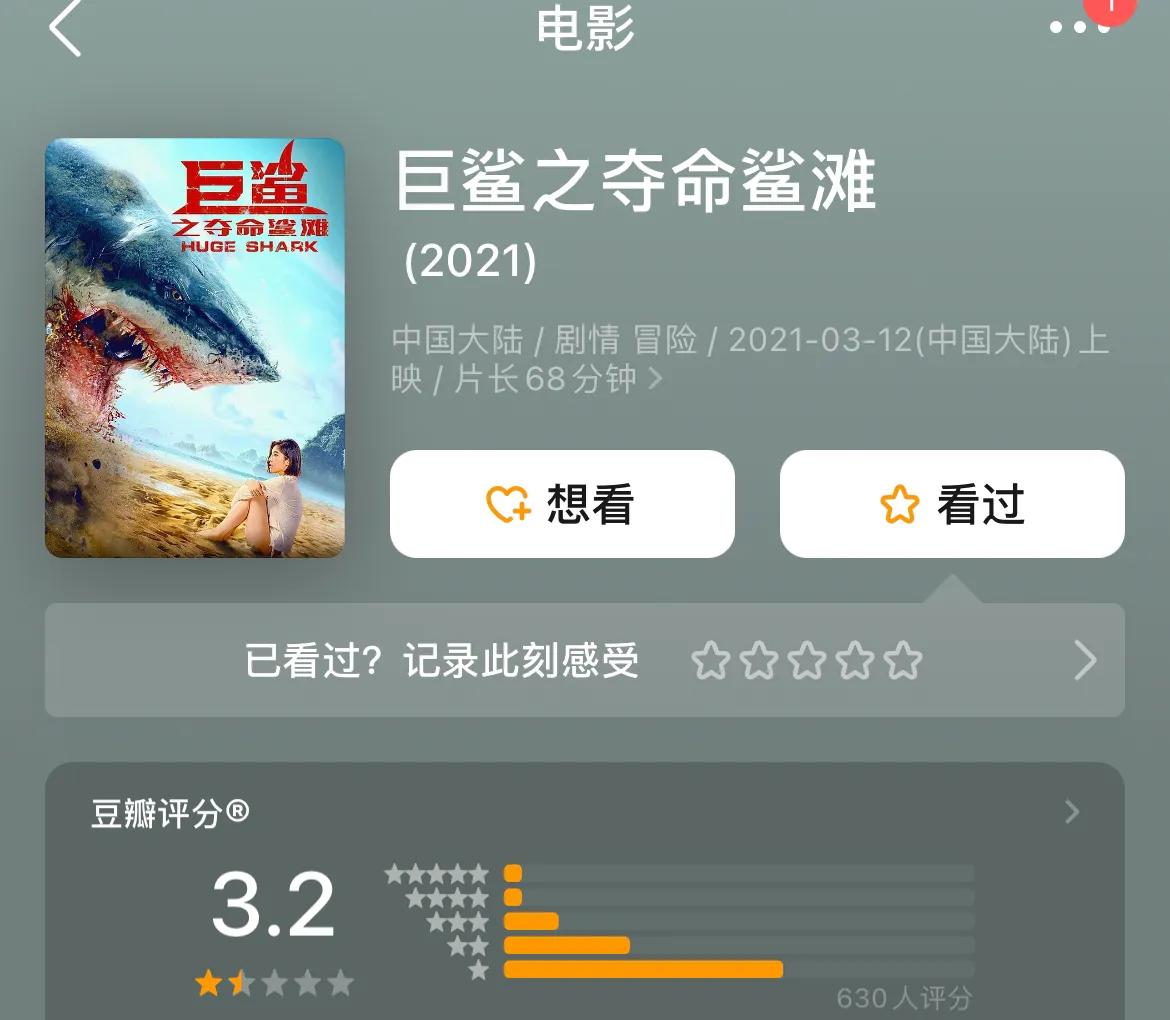 在上半年3月份上映,由赵奕欢主演的电影《巨鲨之夺命鲨滩》,评分低至3.3分。
