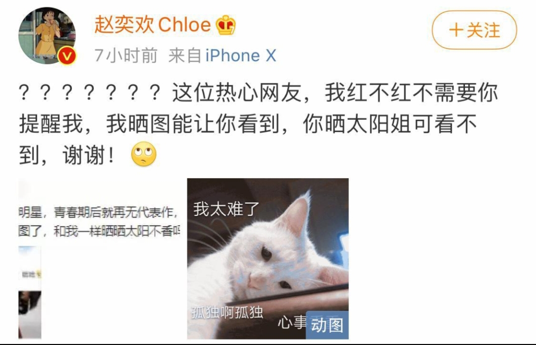 5月6日,有一位路人发文质疑赵奕欢继《青春期》后再无代表作,人不红,却天天晒美图刷存在感。随后赵奕欢本尊发微博回怼,称自己红不红不需要你提醒,自己晒的图能被对方看到,但对方晒得太阳自己可看不到。