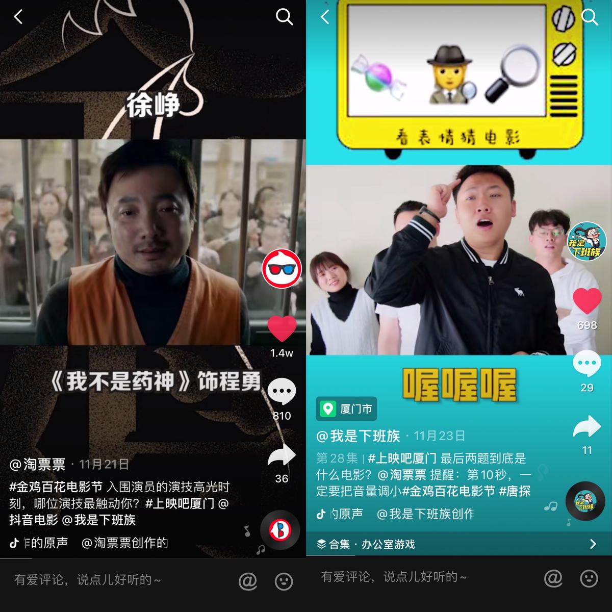 围绕致经典、诉影事、再创造、闹狂欢四大创作方向,用模仿经典桥段、微电影片场、vlog、剧情、技术流、抖出最爱电影等多元化表达,在金鸡举办期间,上映吧厦门通过今日头条、抖音搭建线上用户互动阵地,联合淘票票官抖,围绕电影节产出包含金鸡影迷嘉年华在内的“最佳影片猜测”“看emoji猜电影”“戏精学院”等多个热门视频,汇聚用户电影月讨论热度与参与热情。