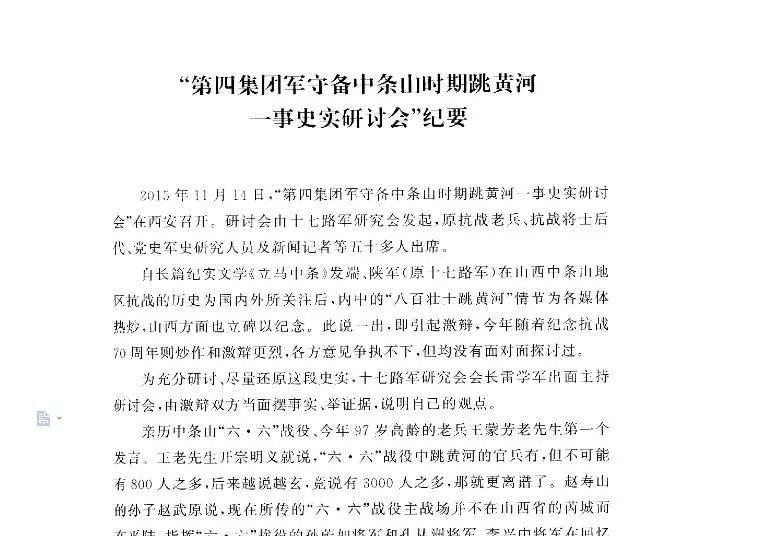 2015年11月,十七路军研究会专门召开了“八百壮士跳黄河”的研讨会,邀请抗战老兵、抗战将士后代、党史军史研究人员和新闻记者50多人参与。由双方摆事实、举证据,当面说明自己的观点。