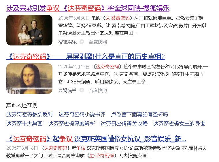 2006年改编自这本小说的同名影片达芬奇密码上映,引发了和宗教有关的巨大争议。而争议无形中也增加了人们走进影院观赏影片的好奇。