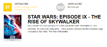 《星球大战9:天行者崛起》马上就将在12月20日中美院线同步上映,而早两日正是该片全球口碑与评分解禁日。目前烂番茄新鲜度56%,mtc 57分。