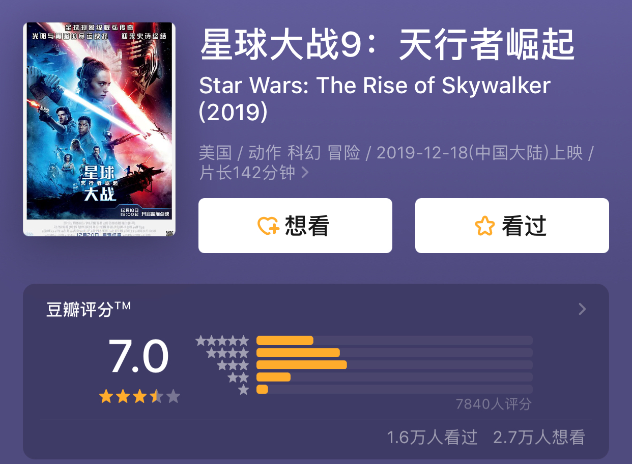 在12月18日开启了提前点映后,《星球大战9:天行者崛起》的豆瓣评分目前为7.0分,该影片正在热映中。